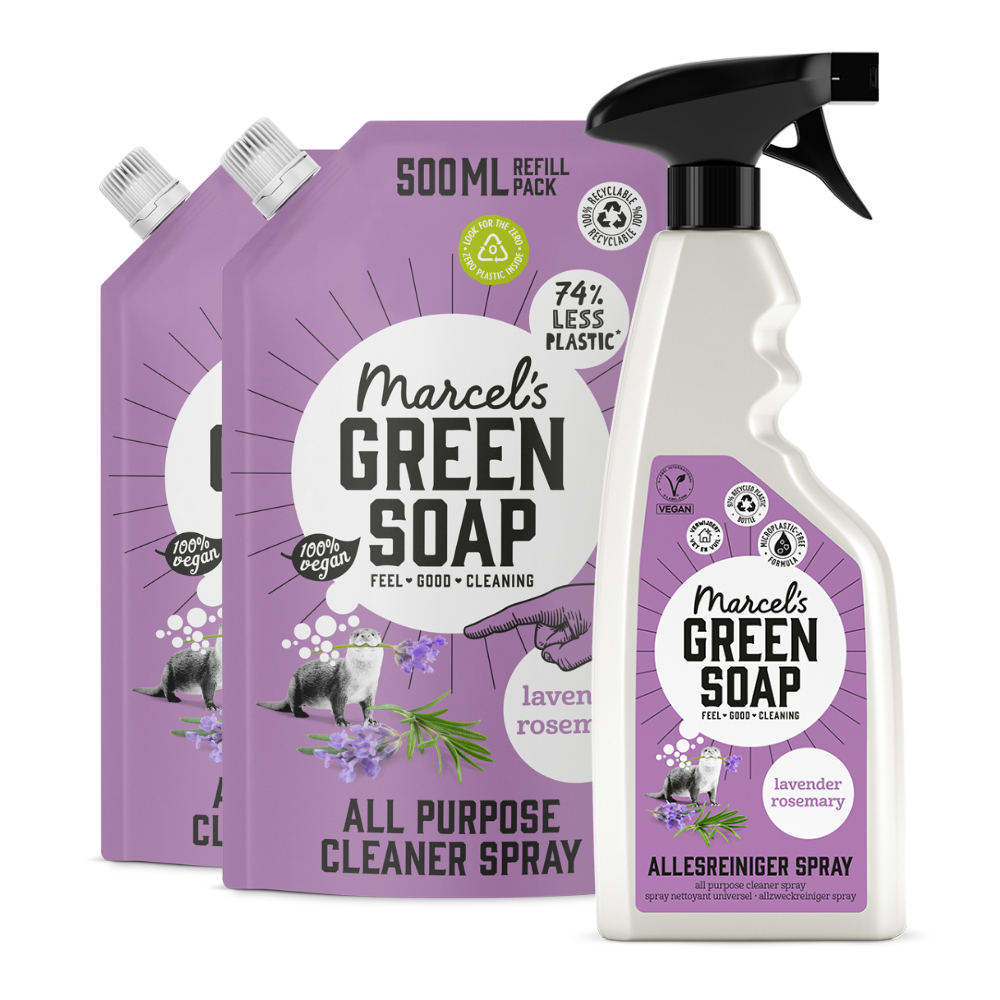 Das Allzweckreinigungsspray von Marcel's Green Soap wurde mit Rücksicht auf den Planeten hergestellt: Die Flasche besteht zu 100% aus recyceltem Kunststoff und kann mit unseren Nachfüllbeuteln nachgefüllt werden. Die Formel ist mikroplastikfrei (ECHA-Definition) und zu mindestens 95,08% (leicht) biologisch abbaubar gemäß den OECD-Richtlinien.
