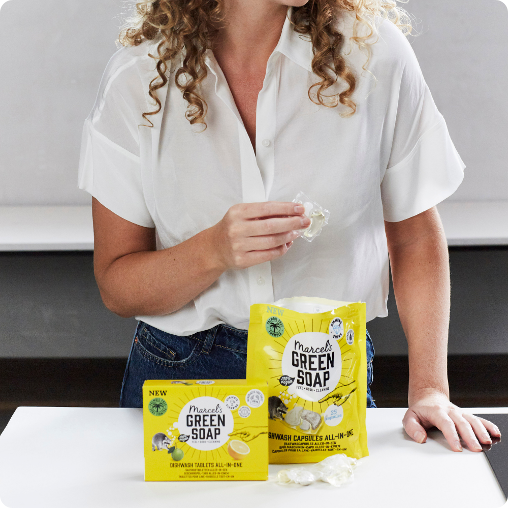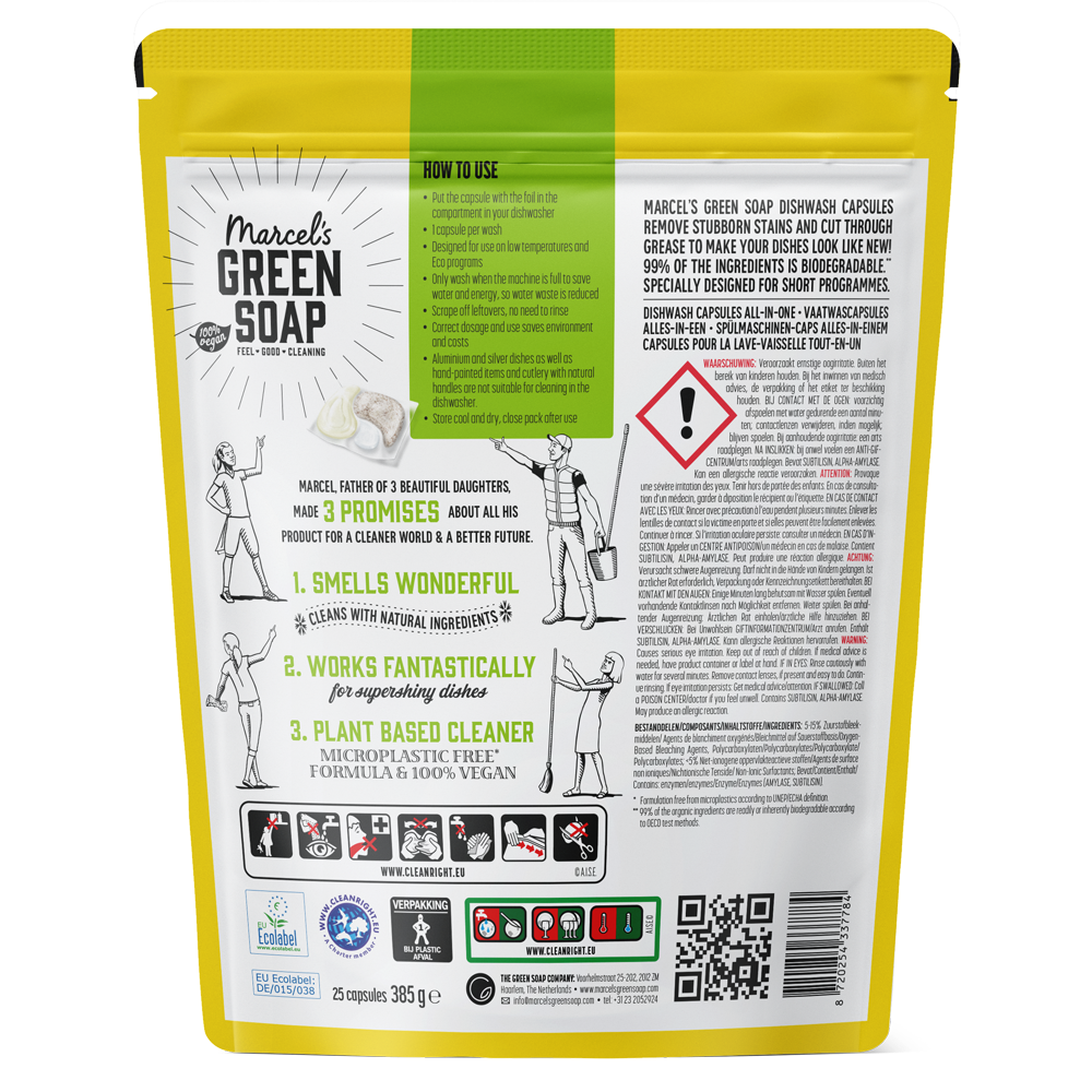 The Dishwash Capsules from Marcel's Green Soap are made with care for the planet. The packaging is designed to be recycled. The formula is microplastic-free (ECHA definition) and at least 99% (readily) biodegradable according to OECD guidelines.