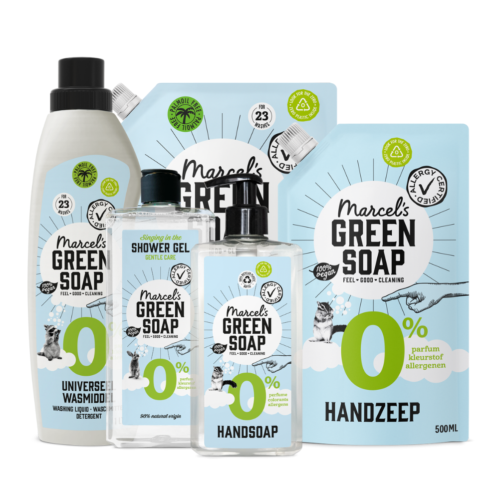 Zorgeloos wassen, van top tot teen. Marcels Green Soap 0% Starterkit bevat onze parfumvrije handzeep, wasmiddel, wasmiddel refill en showergel. Alle producten uit onze 0% lijn zijn speciaal ontwikkeld voor de gevoelige huid en Allergy Certified.