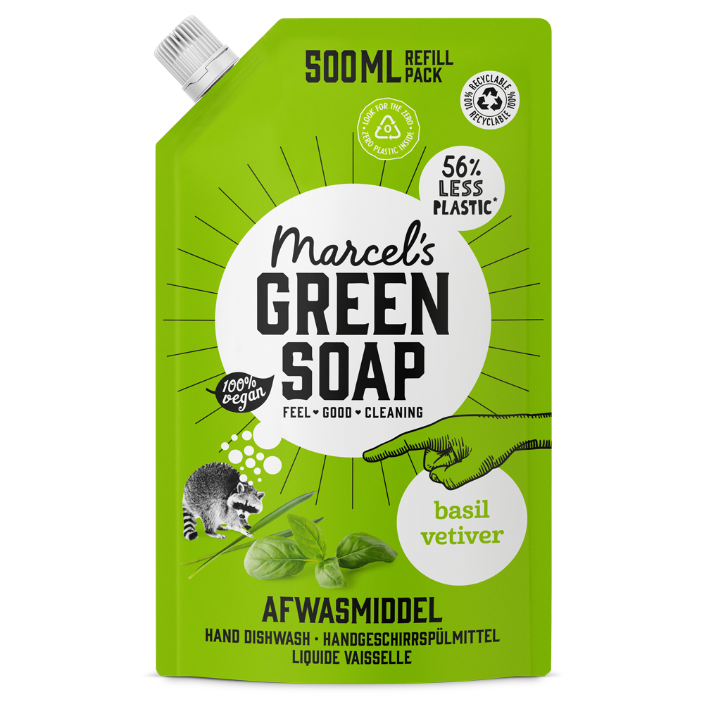 Marcel's Green Soap Afwasmiddel voor een stralend schone vaat. Met de heerlijke geur van Basilicum & Vetiver voor een verfrissend en ontspannen handafwasje. Met deze voordelige refill bespaar je 56% plastic t.o.v. de fles.