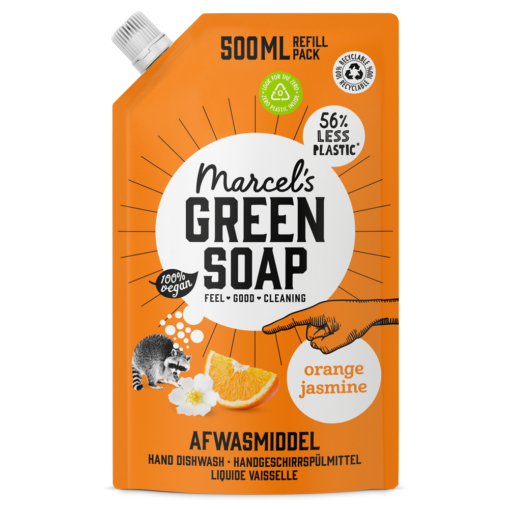 Marcel’s Green Soap Afwasmiddel voor een stralend schone vaat. Met de heerlijke geur van Sinaasappel & Jasmijn voor een verfrissend en ontspannen handafwasje. Met deze voordelige refill bespaar je 56% plastic t.o.v. de fles.