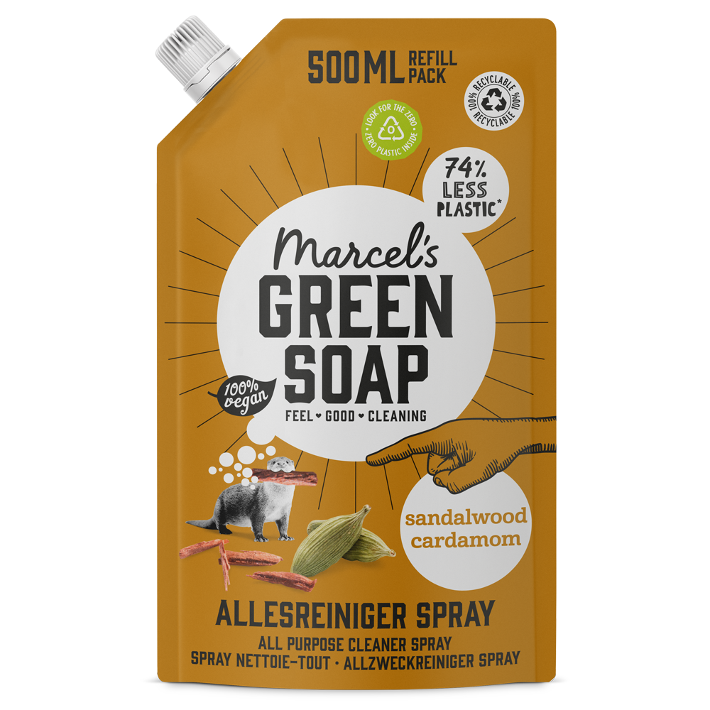 Marcel’s Green Soap Allesreiniger Spray voor de snelle schoonmaakklus tussendoor. Met de heerlijke geur van Sandelhout & Kardemom. Met deze voordelige refill bespaar je 74% plastic t.o.v. de fles.