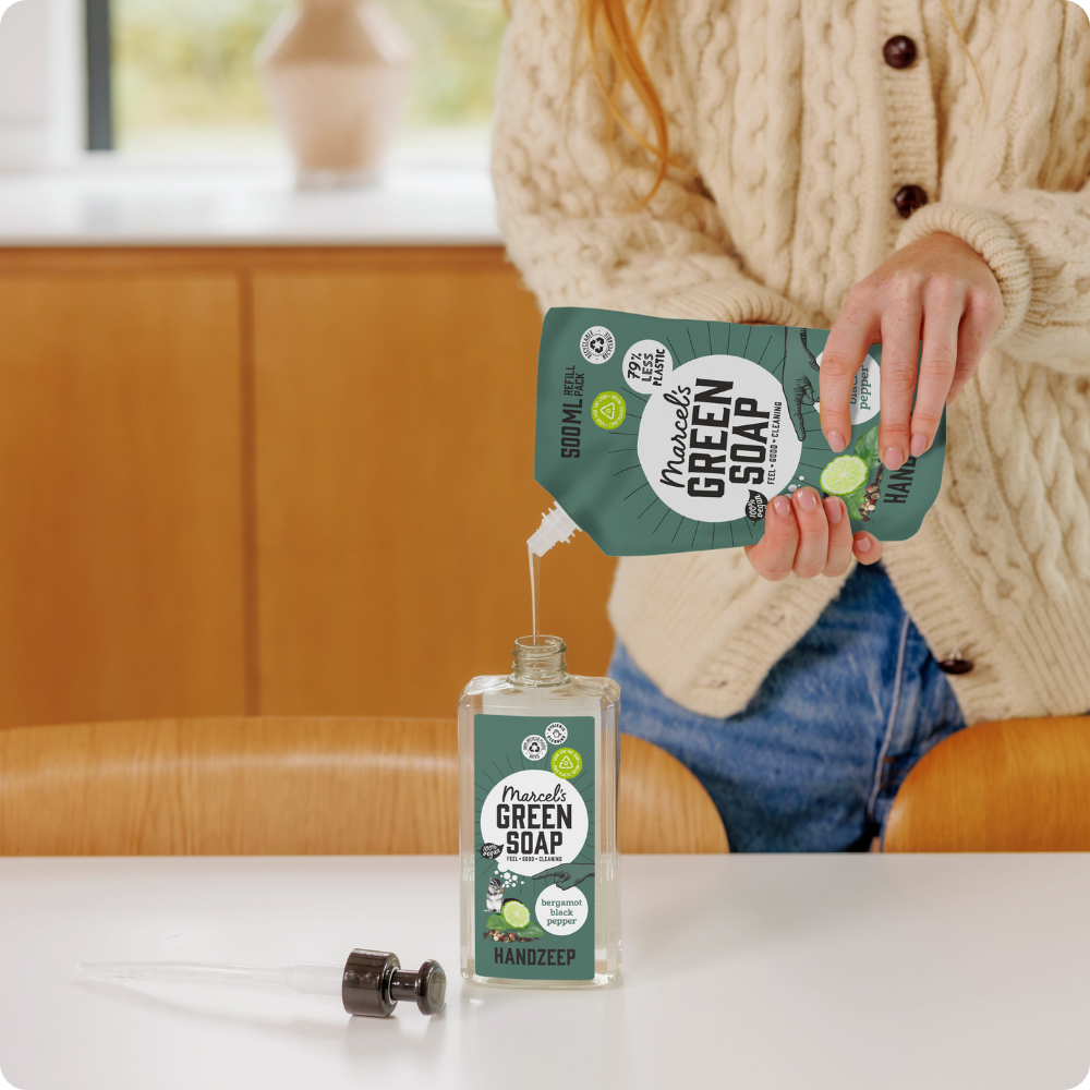 Marcel's Green Soap Hand Soap for clean and soft hands. With the delicious scent of Black Pepper & Bergamot and enriched with vegetable glycerine for extra hydration. Bottle empty? Simply refill it with the Hand Soap Refill Black Pepper & Bergamot and save plastic!